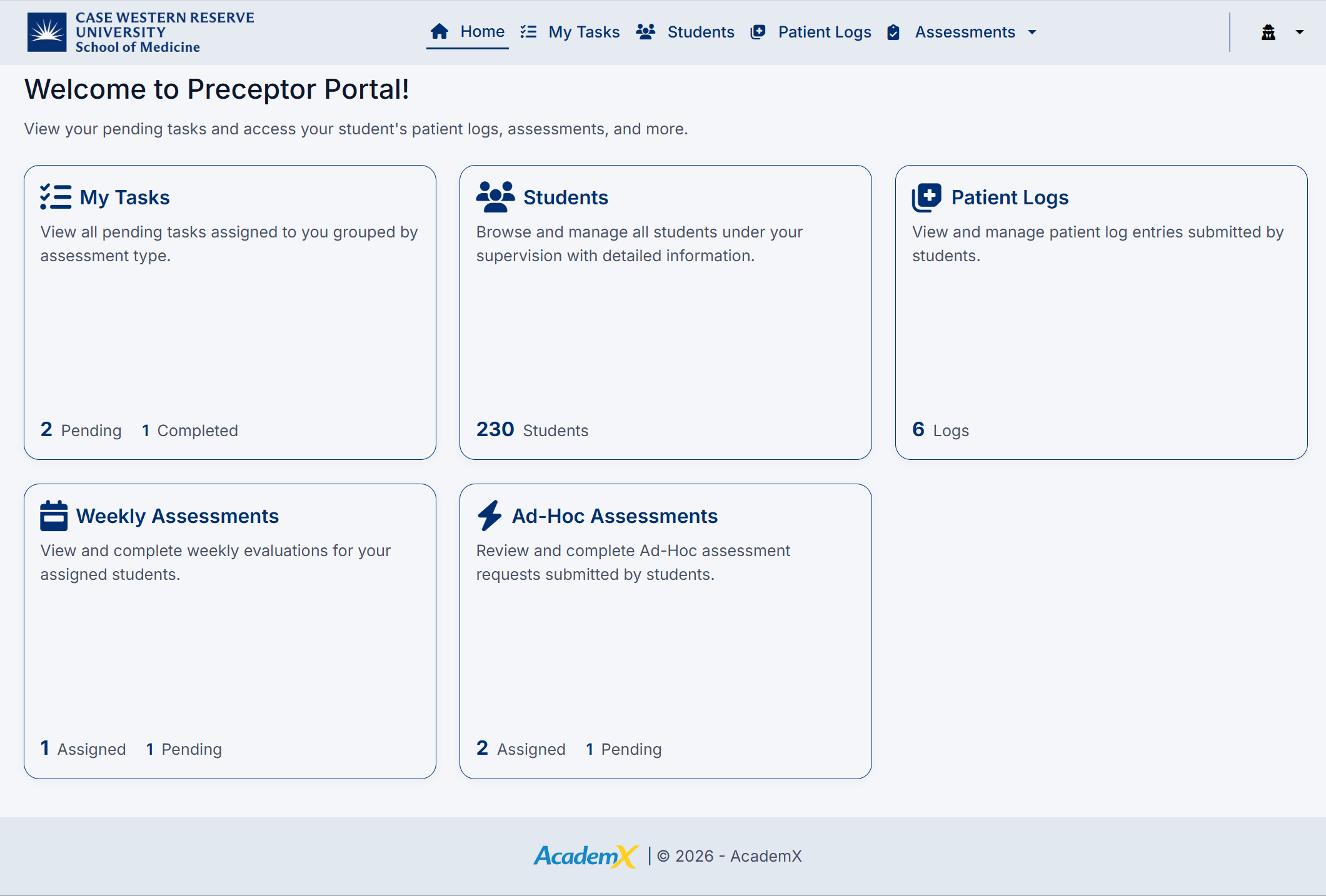 The Preceptor Dashboard is the central hub for managing your students, reviewing patient logs, and completing assessments. It provides a clear summary of your responsibilities and quick access to key areas of the system.
